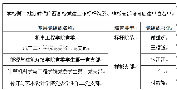 近日,自治区党委教育工委公布第二批新时代广西高校党建示范创建和质量创优工作培育创建单位评选结果。我校机电工程学院党委获评为广西高校党建工作“标杆院系”培育创建单位。汽车工程学院党委教师党支部、能源与建筑环境学院党委学生第一党支部、计算机科学与工程学院党委学生第二党支部、传媒与艺术设计学院党委学生第二党支部获评广西高校党建工作“样板支部”培育创建单位。